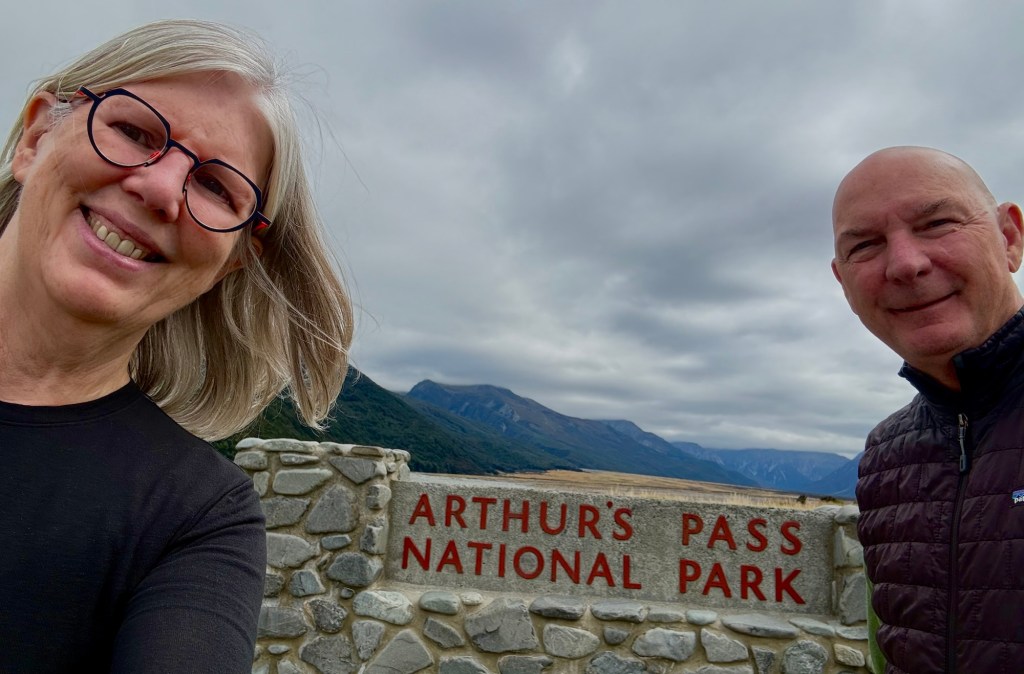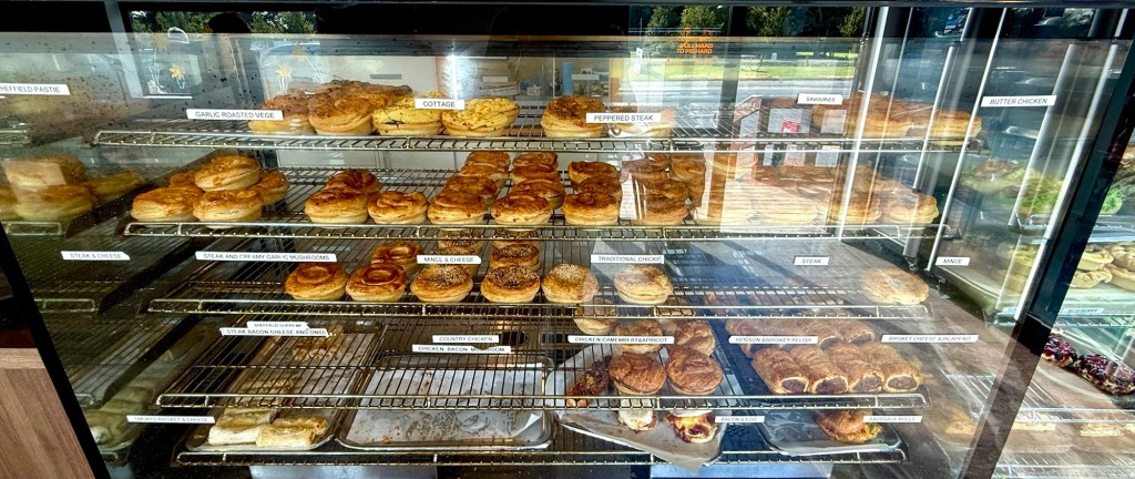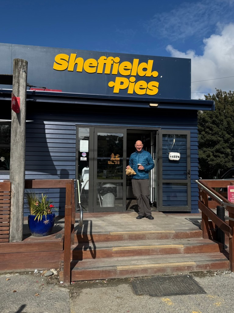 Arthur’s Pass was on the agenda, and we had a stop bookmarked before we even left town. Sheffield, New Zealand — yes, there is one, and yes, we had to go — is home to the World Famous Sheffield Pie Shop, which has been turning out award-winning pies since the mid-1970s. Over twenty varieties, meat and fruit, with a pastry that people apparently drive out of their way for. We can confirm the reputation is deserved. We also discovered the caramel slice — a chocolate-topped caramel bar — and someone needs to share that recipe with us immediately.