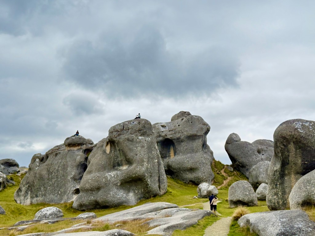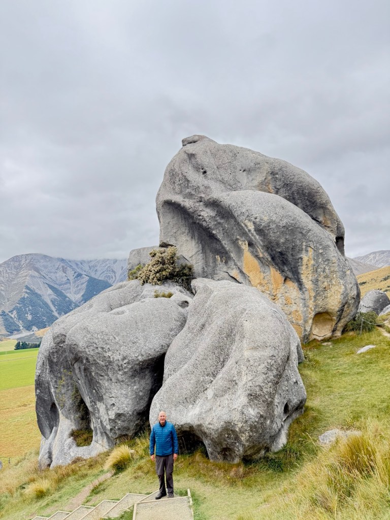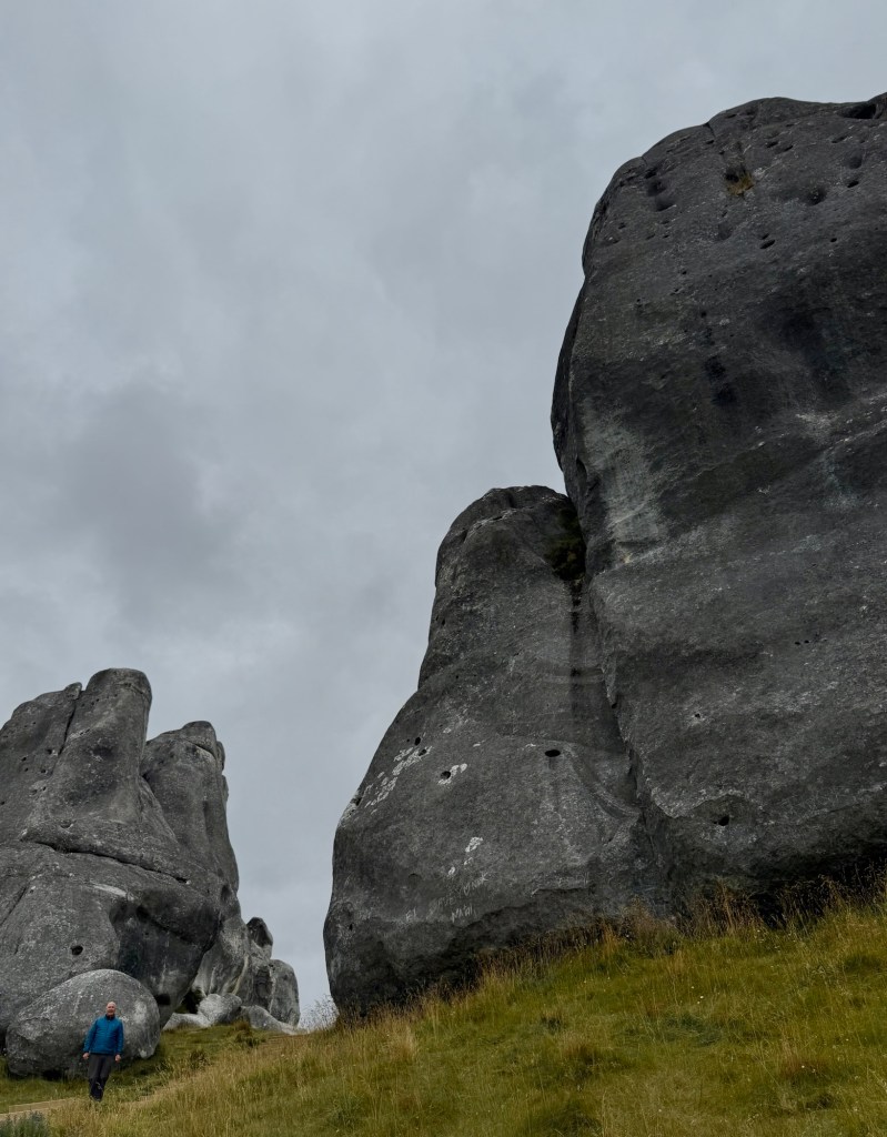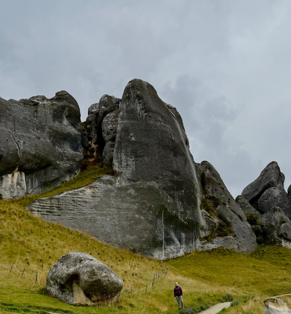 Arthur’s Pass is the highest road crossing of the Southern Alps, and the drive earns it. The first major stop was Kura Tāwhiti, also known as Castle Hill — giant limestone formations rising out of the tussock in clusters, some up to fifty meters high. It looks like a set designer’s idea of a fantasy landscape, and it apparently struck Peter Jackson the same way, since scenes from the Chronicles of Narnia were filmed here. But the real story is botanical. This is the site of the first reserve in New Zealand established specifically to protect a single plant — the Castle Hill buttercup, with only 67 known plants in existence, all of them here. The reserve also shelters limestone wheatgrass and a tiny sedge found nowhere else on earth. The rocks are extraordinary, but knowing what’s growing quietly around your feet makes it a different kind of walk.