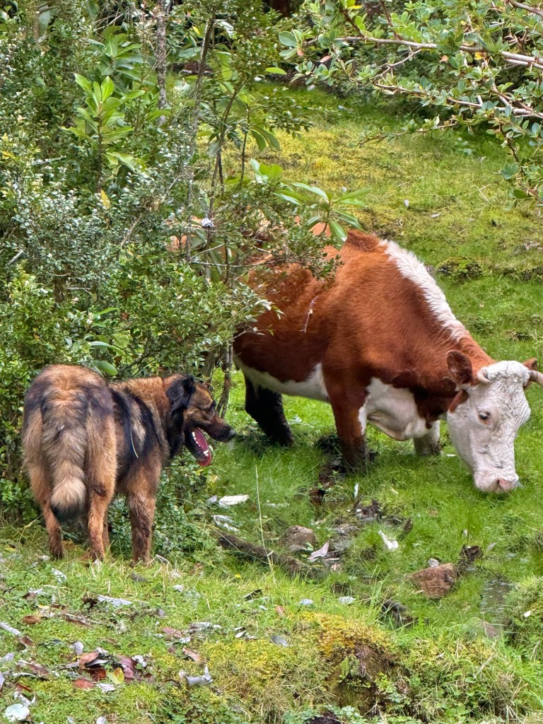 In the afternoon, we came across a small trail on a cattle farmer’s land. As we started in, he met us at the fence and collected a dollar each for access. The trail led through a pasture—dodging cow pies along the way—across a log bridge, and through a short stretch of woods. On the other side, a few cows were grazing on a hillside. While taking a photo of one standing behind a tree, we noticed a dog nearby, watching. When the cow stepped forward and sank into the mud, the dog sprang into action, barking wildly. Three more dogs quickly arrived, circling behind the cow and barking even louder. Eventually, the cow managed to struggle free, and the dogs immediately turned their attention to us, leading the way up the trail. At the top, they flopped down to rest while we took in the view. On the way back, they stayed with us, only barking to nudge a stray cow back into place. Watching them work—and seeing the life they had out here in Chile—was something we wouldn’t forget.