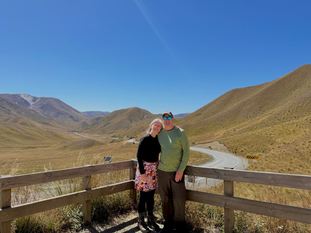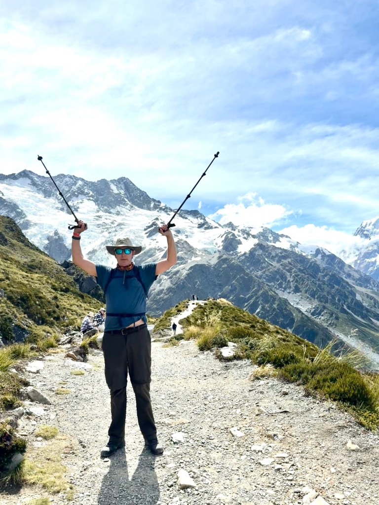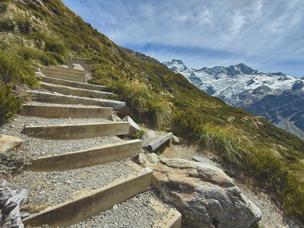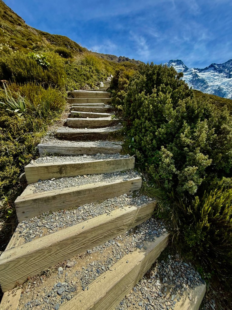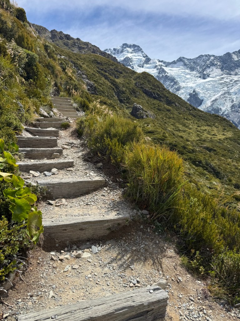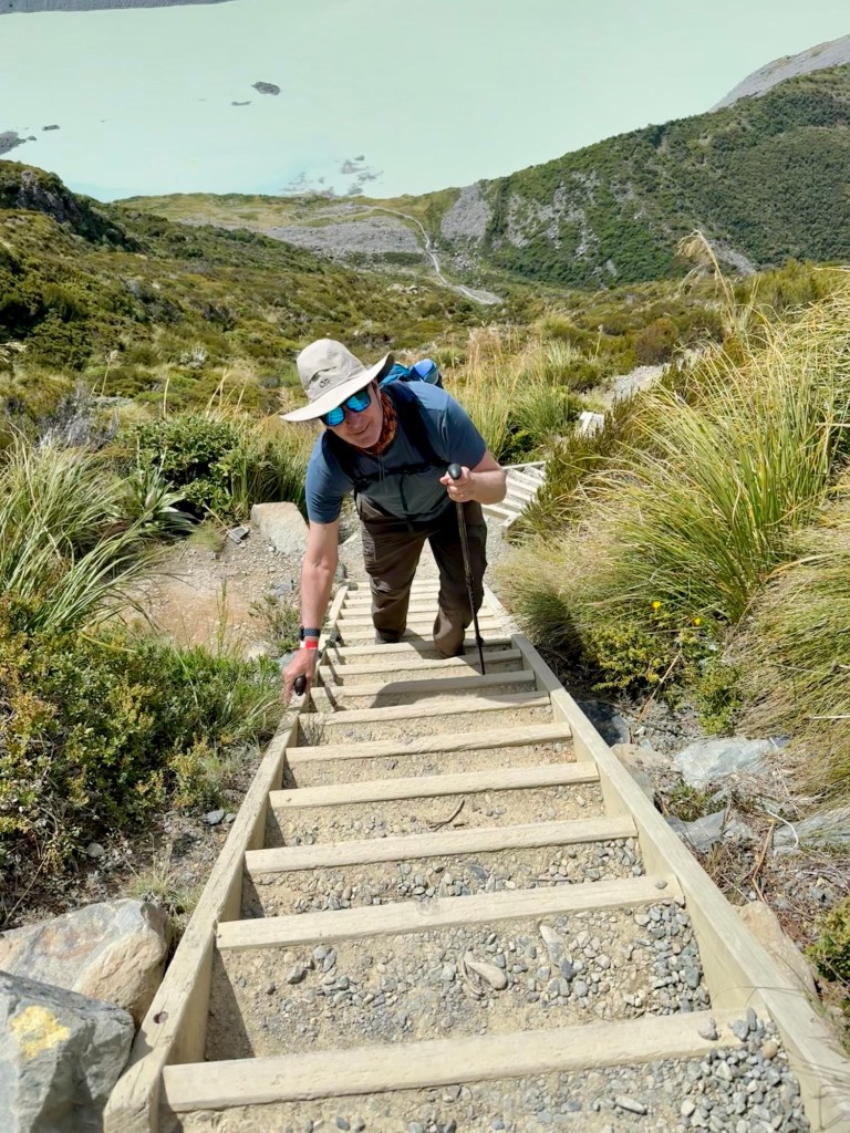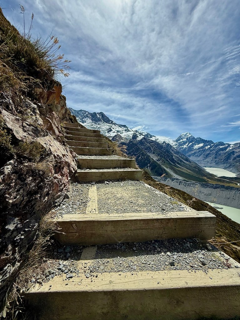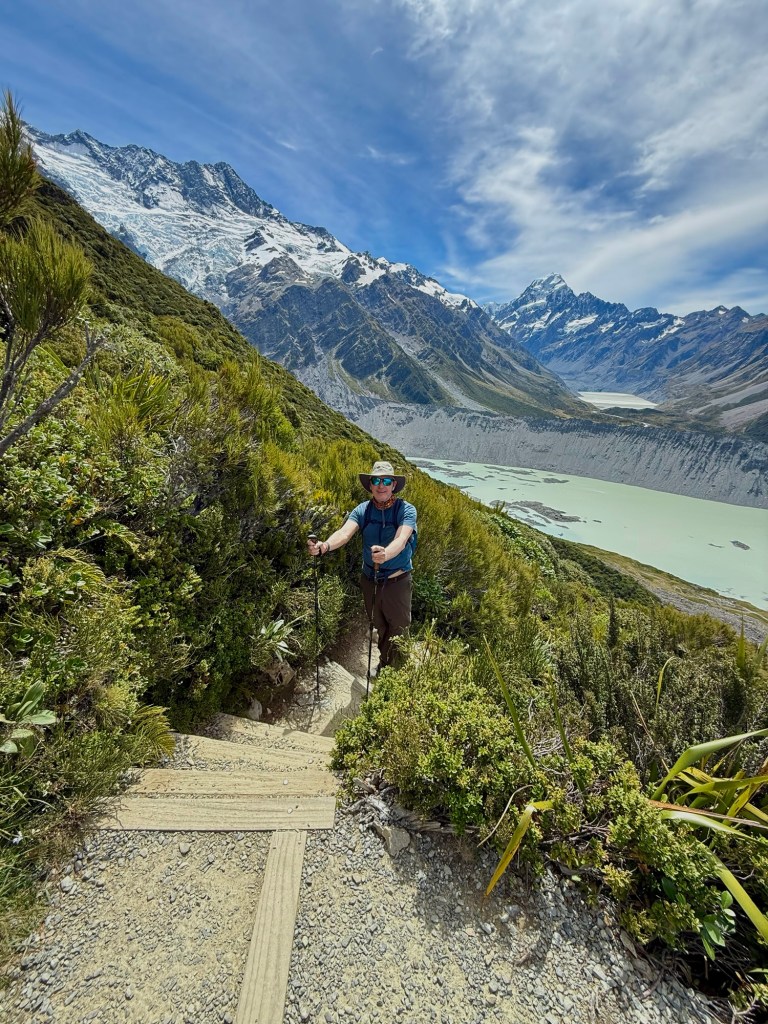 Back on the ground, we drove up to the Mount Cook trailhead and tackled the Sealy Tarns hike — 2200 steps ranging from eight to twenty-four inches high, straight up the mountain. It was hard. We stopped constantly, ate every high-sugar piece of fruit we had packed, and talked each other through the moments when turning back seemed reasonable. Other hikers were doing exactly that. We kept going. At the top we found a picnic table, a sweeping view that made every step worthwhile, and a young Israeli couple named Bar and Liel who had taken exactly as long as we had to get there. We shared the table, shared stories, and took our time coming back down — which was easier on the lungs but had plenty to say about our knees. Five and a half hours after we started, we high-fived by the car and drove back to Twizel.
