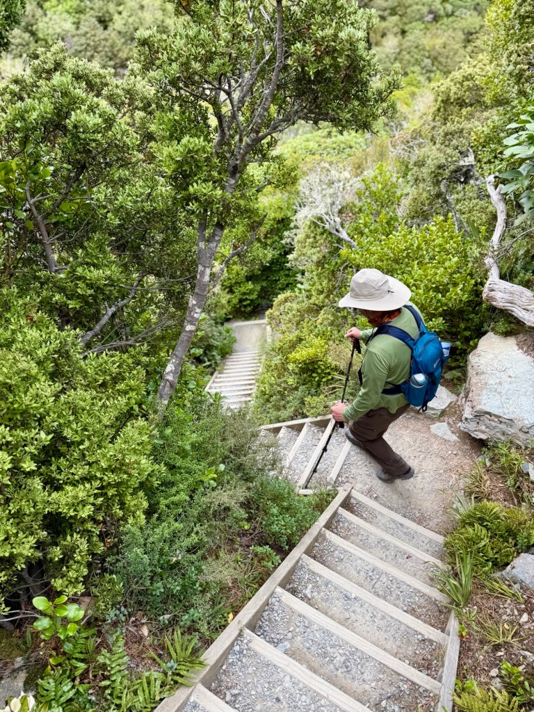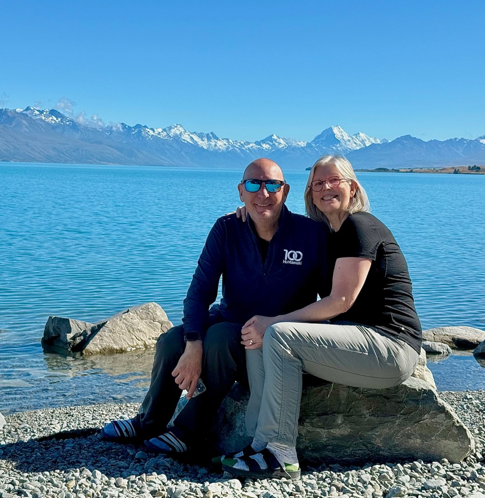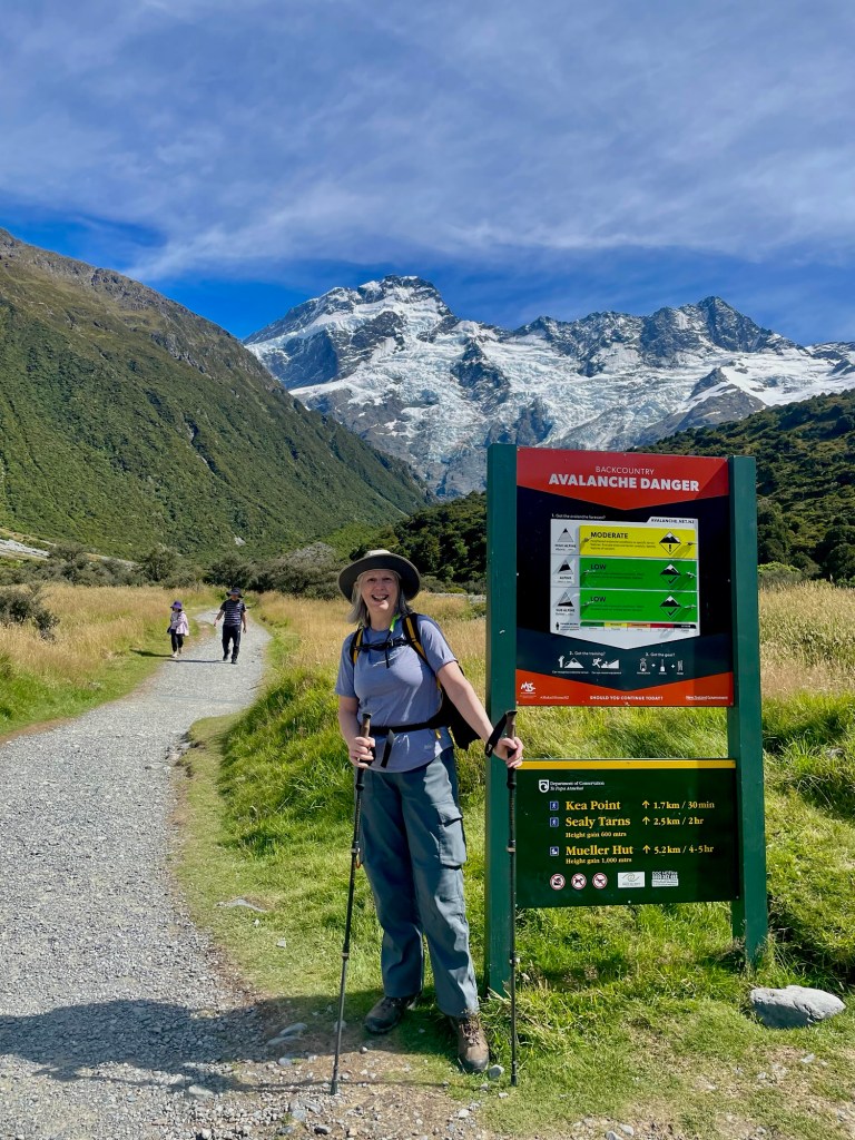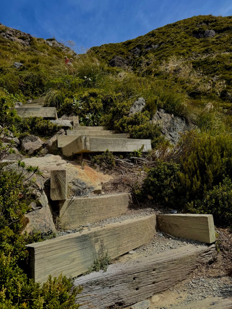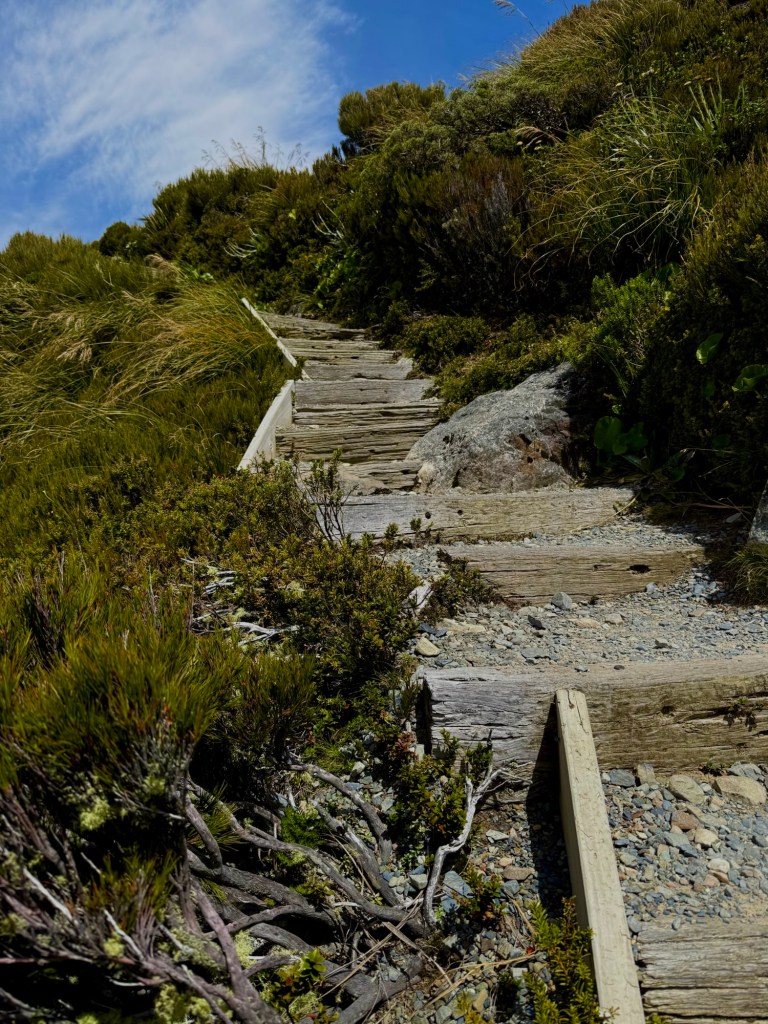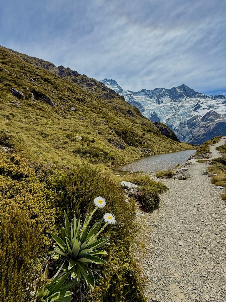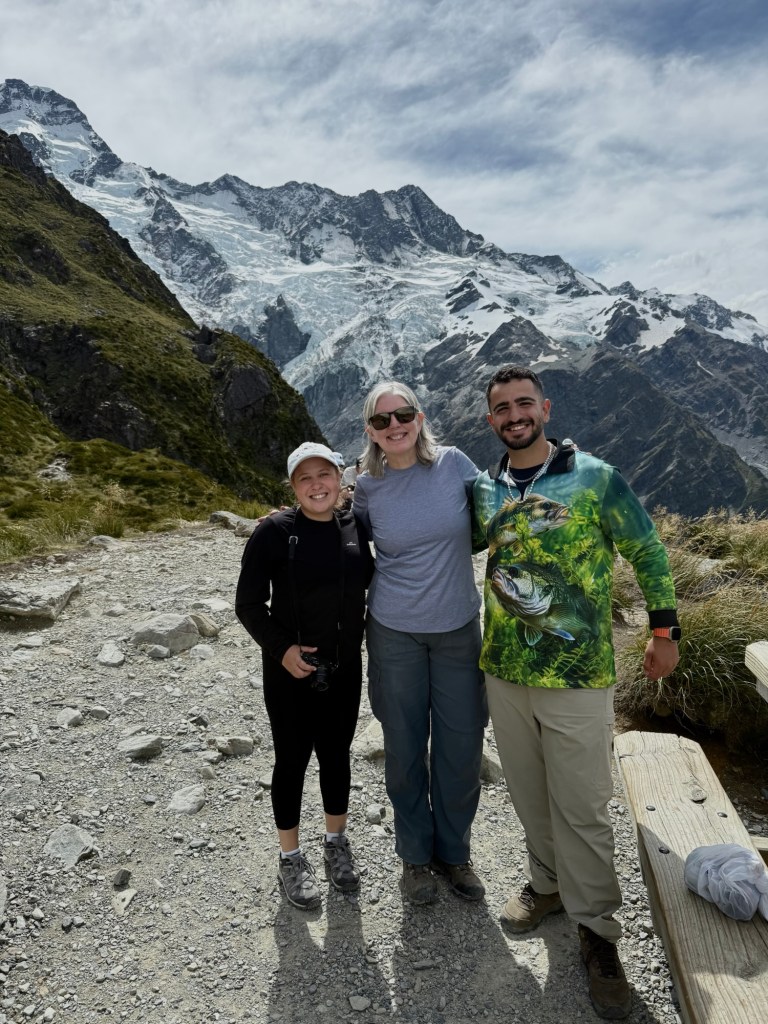 Back on the ground, we drove up to the Mount Cook trailhead and tackled the Sealy Tarns hike — 2200 steps ranging from eight to twenty-four inches high, straight up the mountain. It was hard. We stopped constantly, ate every high-sugar piece of fruit we had packed, and talked each other through the moments when turning back seemed reasonable. Other hikers were doing exactly that. We kept going. At the top we found a picnic table, a sweeping view that made every step worthwhile, and a young Israeli couple named Bar and Liel who had taken exactly as long as we had to get there. We shared the table, shared stories, and took our time coming back down — which was easier on the lungs but had plenty to say about our knees. Five and a half hours after we started, we high-fived by the car and drove back to Twizel.