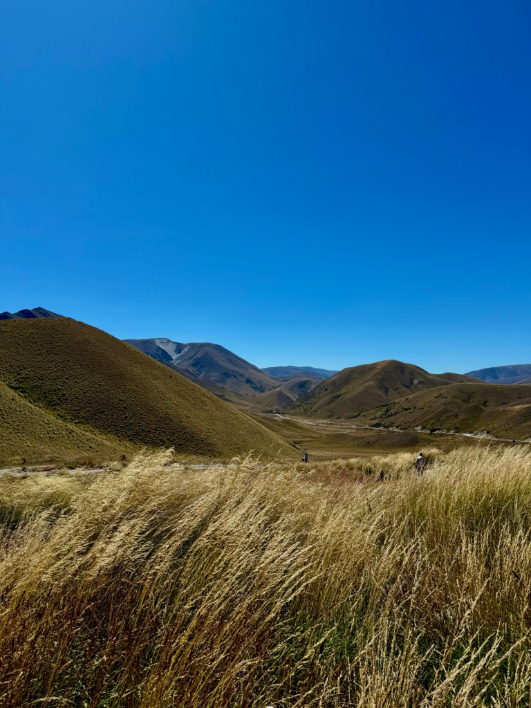 The drive through Lindis Pass stopped us in our tracks more than once. At high altitude, the landscape opens into something almost lunar — tussock-covered hills rolling for miles in every direction, brown and gold and enormous, with a single highway cutting through the middle. It is the kind of scenery that makes you pull over just to stand in it for a minute.