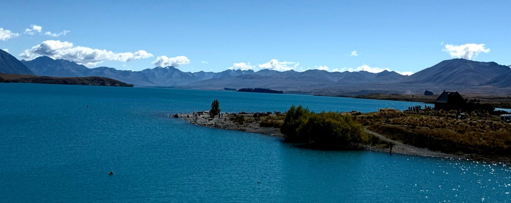The following day brought Lake Tekapo, one of the most photographed lakes in New Zealand, and for good reason — the glacial blue-green water is almost impossible to believe. Tour buses had found it too, so we kept moving, stopping at the little stone Church of the Good Shepherd on the lakeside before sitting through the tourist center’s astronomy show — atmospheric enough, but we’d point you somewhere better. That somewhere better turned out to be the hike up to the Mt. John Observatory, which goes straight uphill through alpine forest before leveling into a long wandering descent alongside the lake. Back in Twizel, we had a lovely dinner at Poppies before heading out on the stargazing tour — and the night sky made everything worth staying up for. The Southern Cross, Orion’s Belt, the Milky Way, Sirius, Alpha Centauri — the closest star to our own sun — all of it overhead, clear and close and humbling. We fell into our container beds well after midnight, already thinking about the drive to Wanaka in the morning.