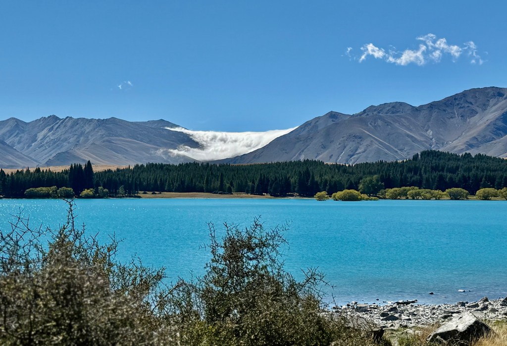 Because Lake Tekapo is in a basin surrounded by mountains, cold air can get trapped in the lower, flatter valleys (especially at night or in winter). Warm, moist air moving over this cold pool can create thick, low-lying fog, often called a foehnwall (or Föhnmauer).