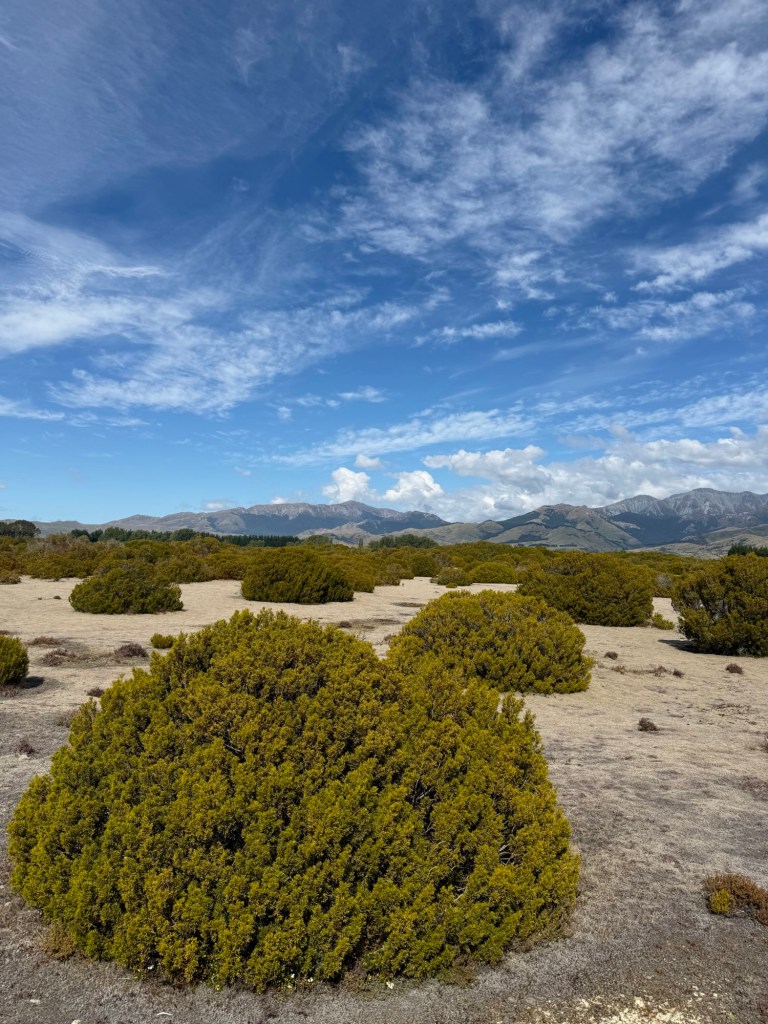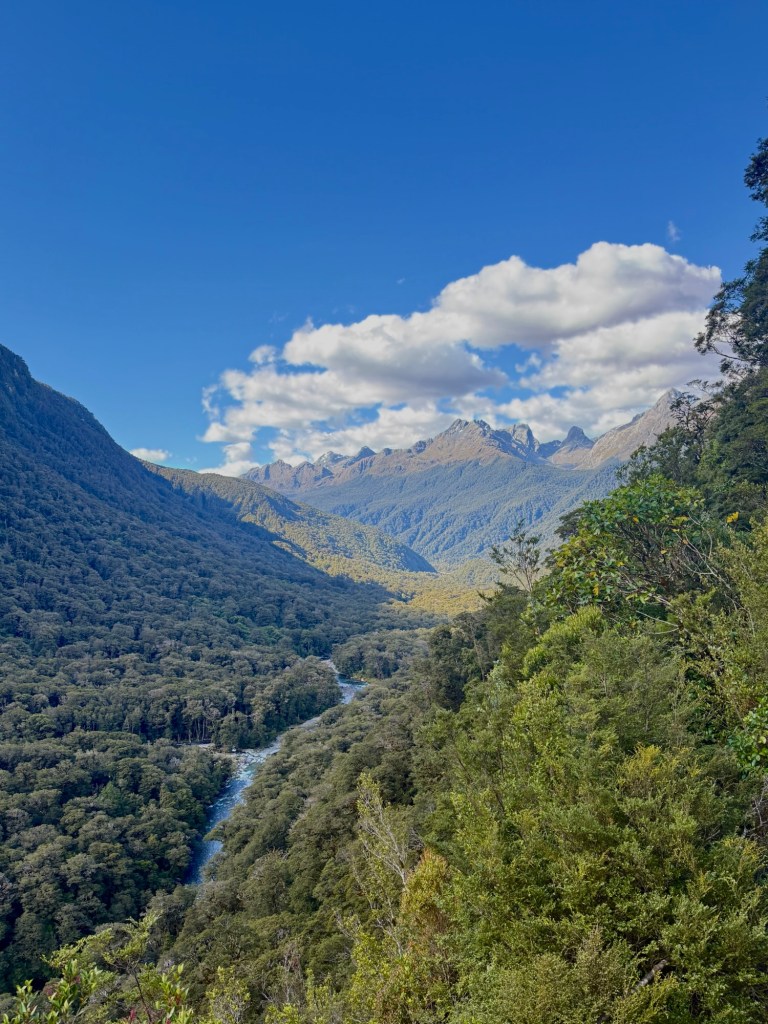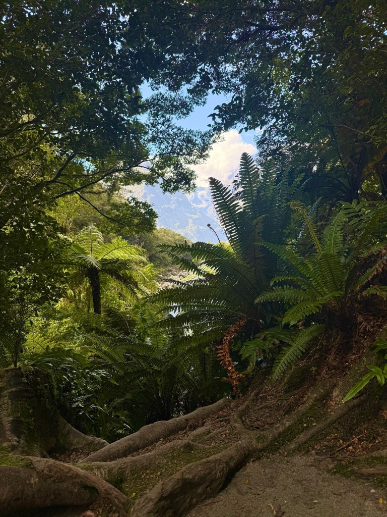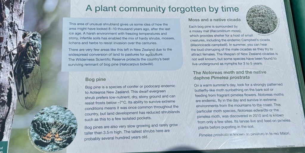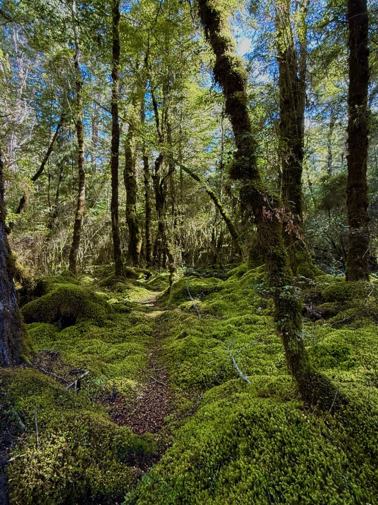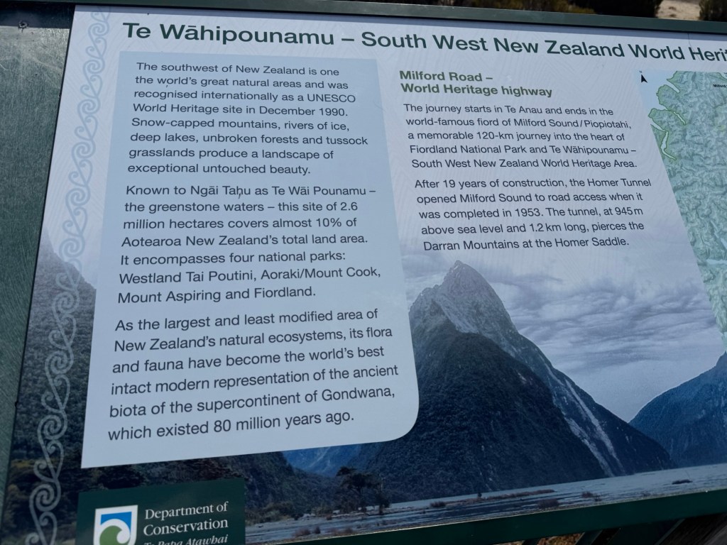 On the drive south toward Te Anau, we pulled over at a roadside viewpoint for the Te Wāhipounamu World Heritage Site. The fields were carpeted in bog pine, a small, low-growing shrub found only in New Zealand. When the glaciers finally retreated thousands of years ago, they left behind thin, leached soils where little else can grow — which is exactly where bog pine takes hold. This landscape is a living record of what much of New Zealand looked like as it slowly recovered from the last ice age. We walked around a bit, admired the thick moss growing under the shrubs, and felt like we’d stumbled onto something most people drive right past.