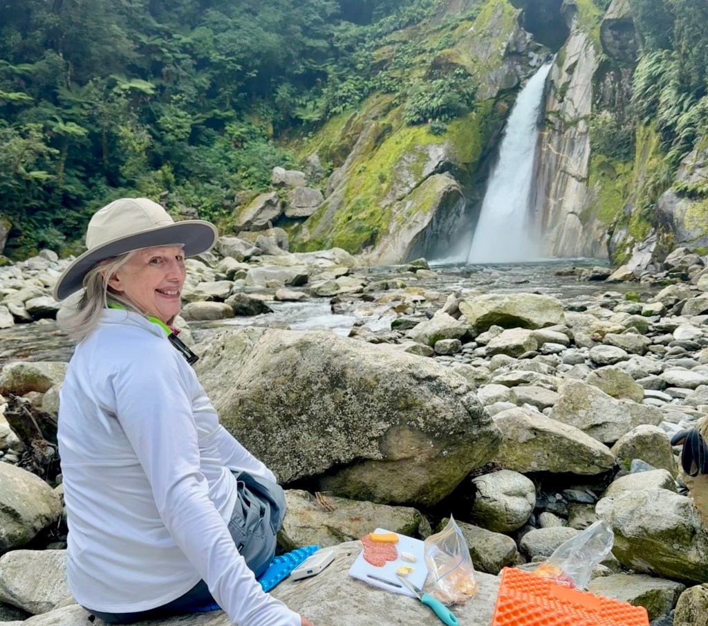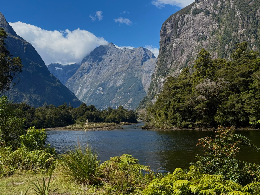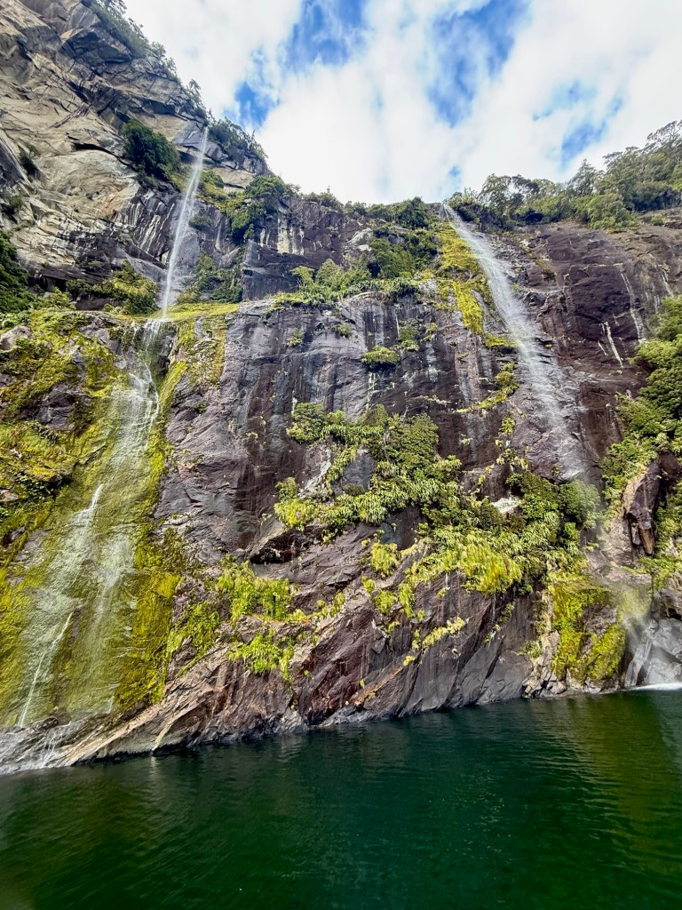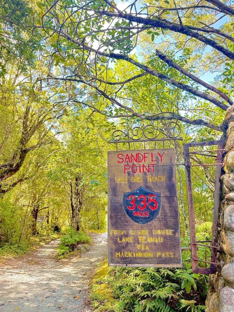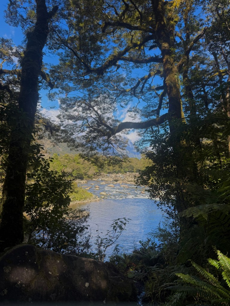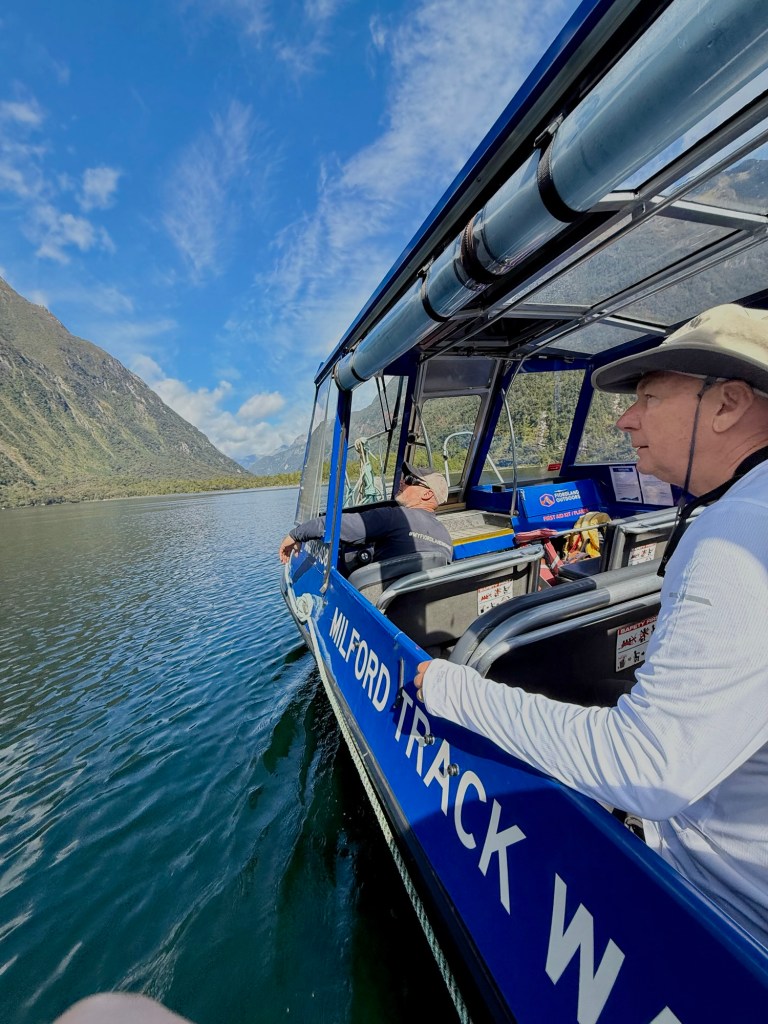 After the cruise, we hopped a water taxi across to Sandfly Point — the endpoint of the famous Milford Track — and hiked in through beech forest along the Arthur River to Giant Gate Falls, about two hours in. Neither of us had done anything quite like this before, and we loved every bit of it. Our water taxi captain Jeff was waiting for us on the late afternoon return, which we appreciated more than he probably knows.