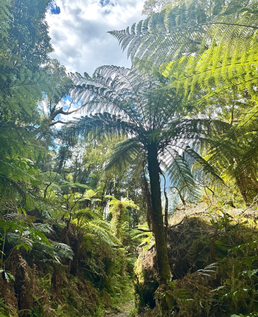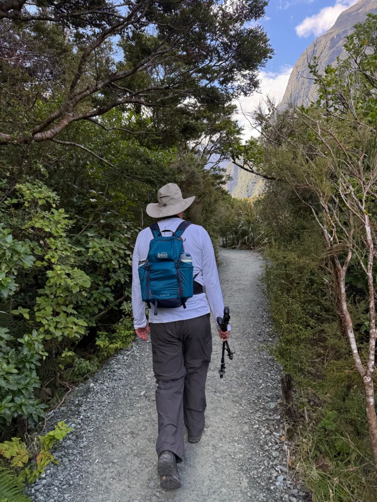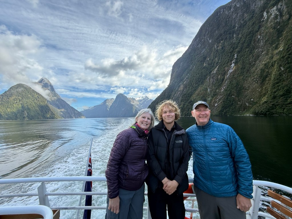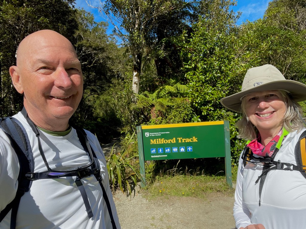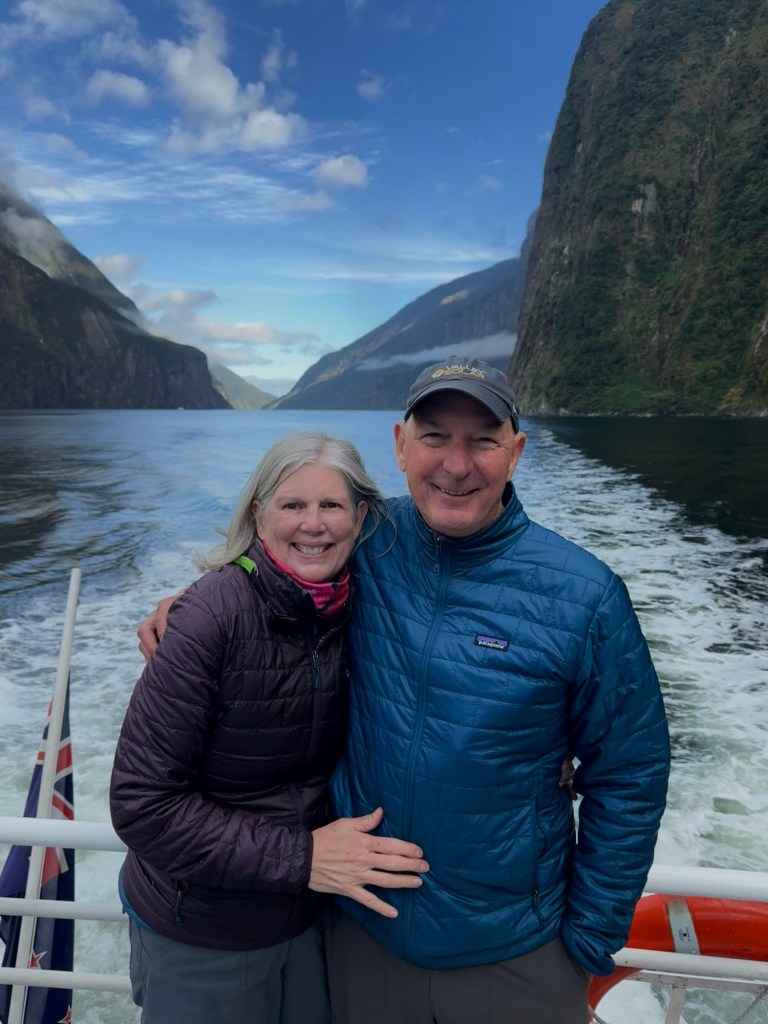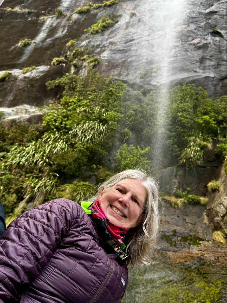 After the cruise, we hopped a water taxi across to Sandfly Point — the endpoint of the famous Milford Track — and hiked in through beech forest along the Arthur River to Giant Gate Falls, about two hours in. Neither of us had done anything quite like this before, and we loved every bit of it. Our water taxi captain Jeff was waiting for us on the late afternoon return, which we appreciated more than he probably knows.