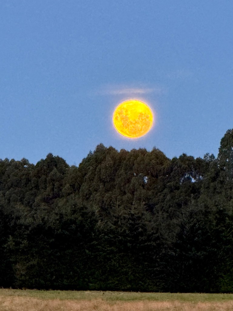 That night there was a full moon eclipse. Clouds rolled in at the key moment, but the sky around it was clear enough to keep us outside longer than was probably wise. We’re retired — we can sleep in.
