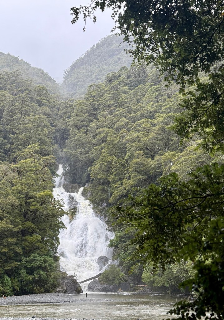 The next morning it rained, so we did the rainy day activity and chased waterfalls along the Haast Pass. We drove all the way out to Roaring Billy Falls first and then made our way back, stopping at every waterfall along the way. Some were right off the road. Others took a short hike through forest so green and mossy and fern-covered it looked like something from a movie – maybe Valinor from LotR? We came back soaked and happy.