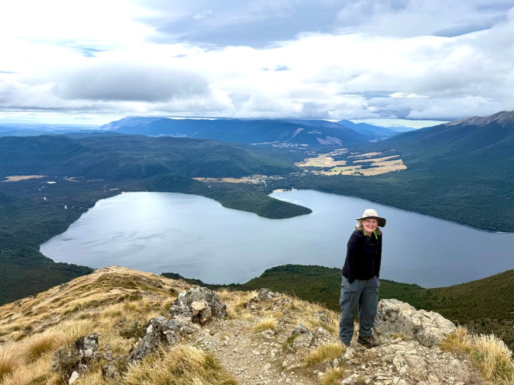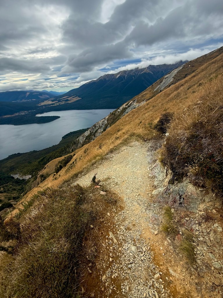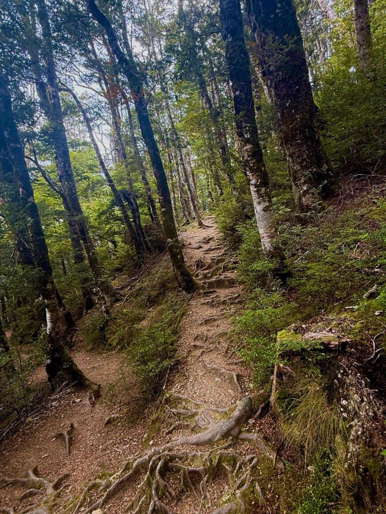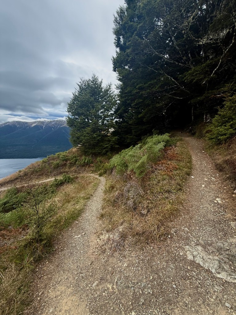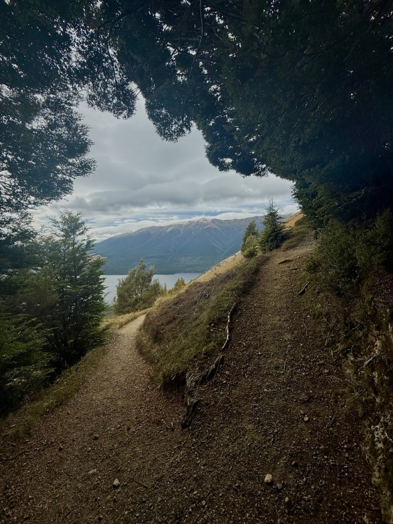Then southwest again to Nelson Lakes National Park and the village of St. Arnaud, where we stayed at the Woodsman’s Den, a hidden cottage near the lake. We’d come specifically for the Mount Robert Circuit, a nine-kilometer loop track that climbs the northern face of Pourangahau above Lake Rotoiti. The track combines two routes — the Pinchgut Track going up, steep and switchbacking through beech forest and open mountainside, and Paddy’s Track coming down along the ridge with views over the lake.